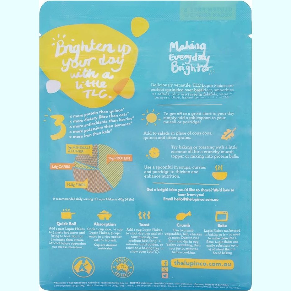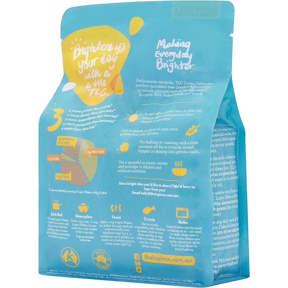 Lupin Flakes pack a seriously tasty and powerful punch. As one of the world's richest source of combined protein and fibre, this Aussie-grown, little legume is gluten free, low GI and only 4% carbs. Plus, they're rich in calcium, potassium, magnesium and iron. Lupin incredible!