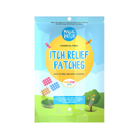 Each pack contains 27 itch relief patches (9 pink itch relief patches, 9 blue itch relief patches, and 9 tan itch relief patches).