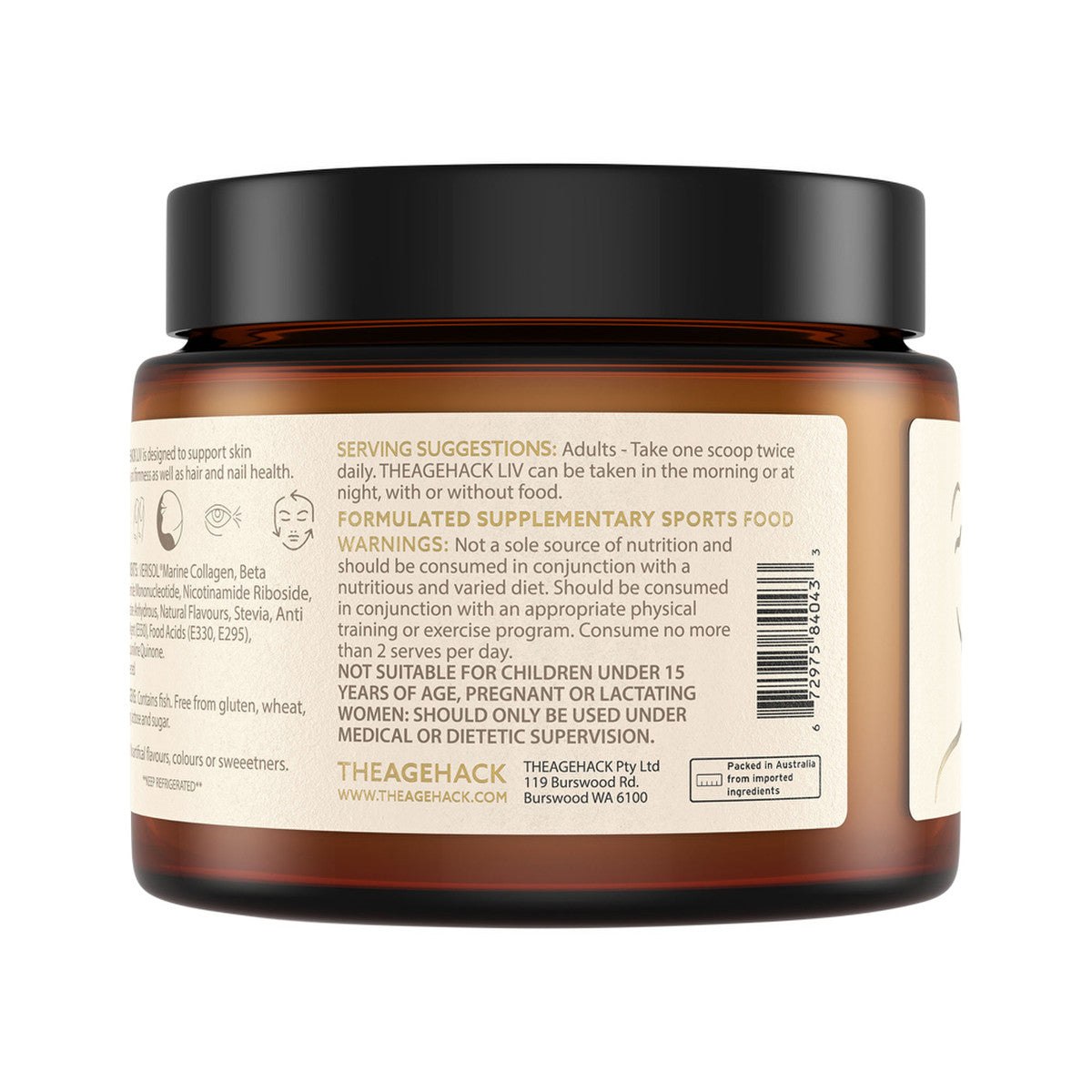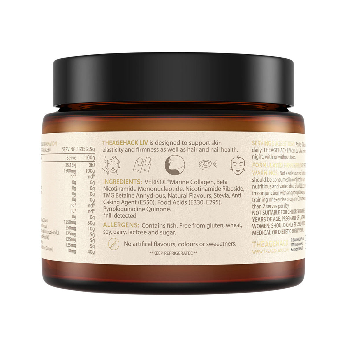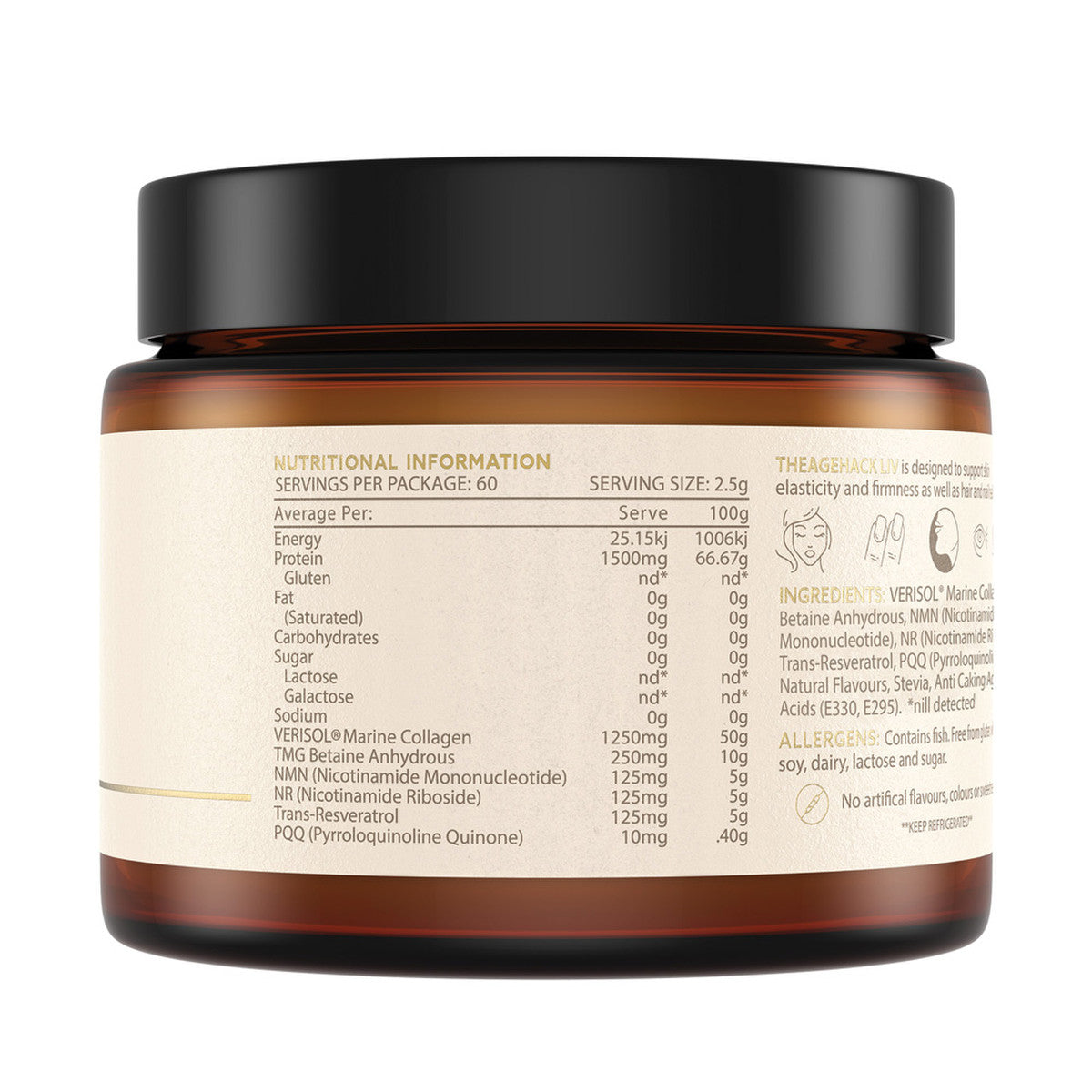 Introducing THEAGEHACK LIV - the world's first complete anti-aging formulation. Our synergistic blend of scientifically advanced ingredients, including Trans-Resveratrol, NMN, NR, TMG, PQQ, and Verisol® Marine Collagen, work together to restore your vitality, energy levels, and youthful glow.