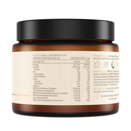 Ingredients: Verisol® Marine Collagen, Beta Nicotinamide Mononucleotide, Nicotinamide Riboside, TMG Betaine Anhydrous, Natural Flavours, Stevia, Anti Caking Agent (E550), Food Acids (E330, E295), Pyrroloquinoline Quinone.