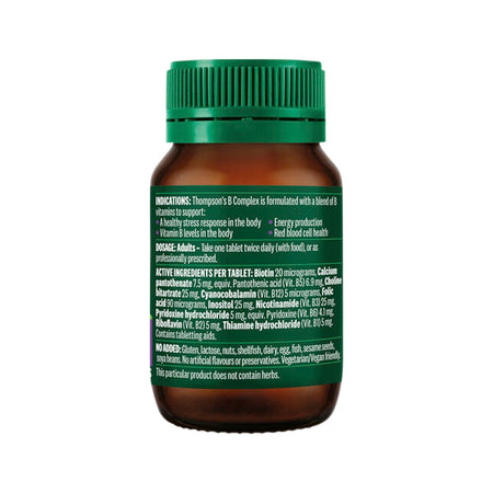 Thompson's B Complex provides a high potency formulation of B vitamins essential for the maintenance of a healthy nervous system and is commonly used to provide valuable support during times of stress.Size: 100tabs