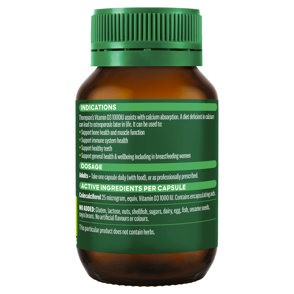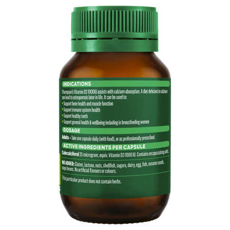 Thompson's Vitamin D3 helps develop, strengthen and maintain healthy bones and teeth. It helps support muscle strength and may assist with bone density. It also assists with Calcium absorption, which is important in preventing osteoporosis in later life and may help reduce the incidence of fractures. It also supports the health and function of the skeleton, may assist in maintaining a healthy pregnancy, supports a healthy immune system and helps maintain general wellbeing.