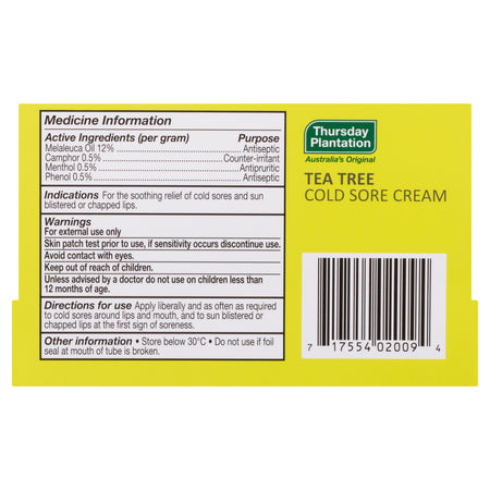 Thursday Plantation Cold Sore Cream provides soothing relief of cold sores and sun blistered or chapped lips.