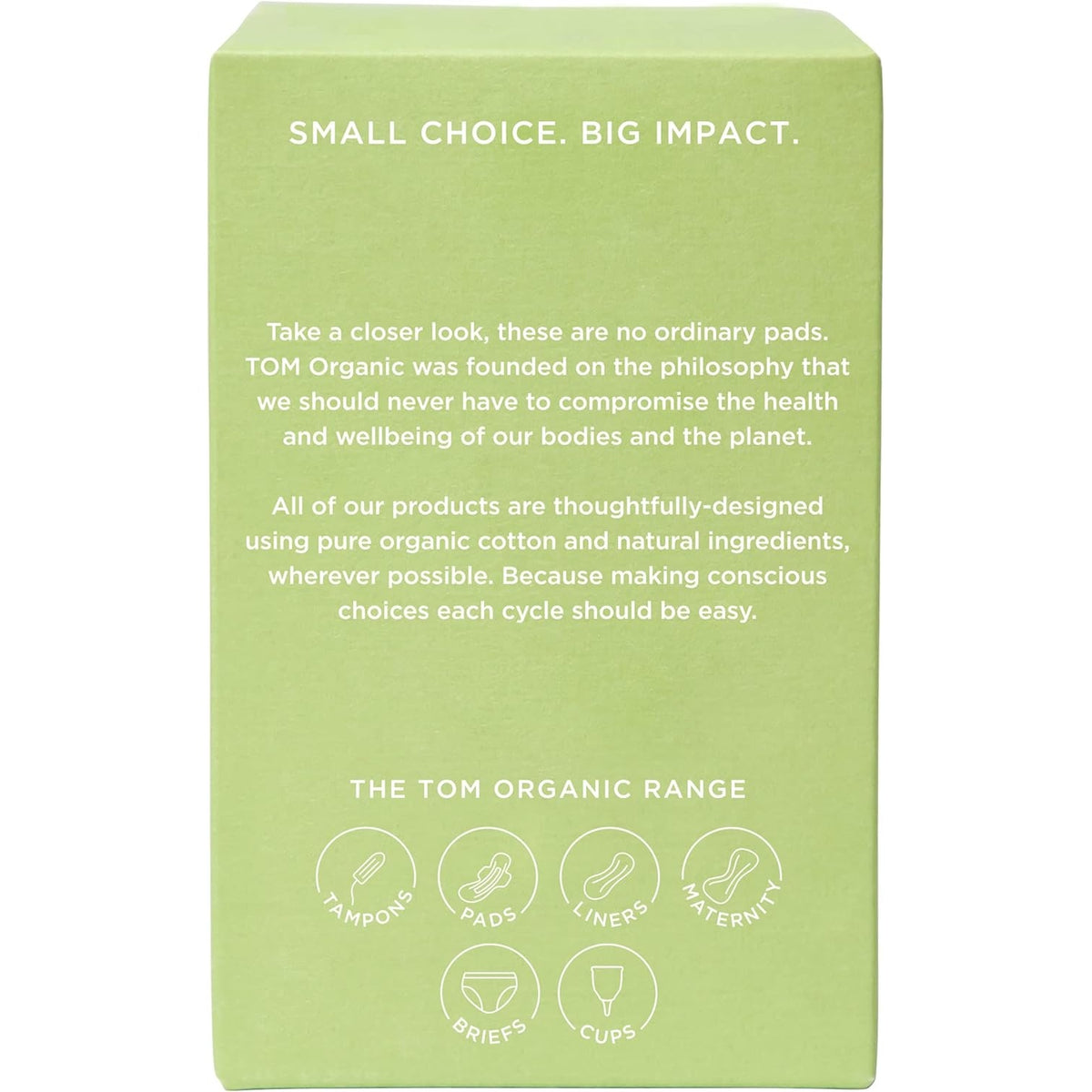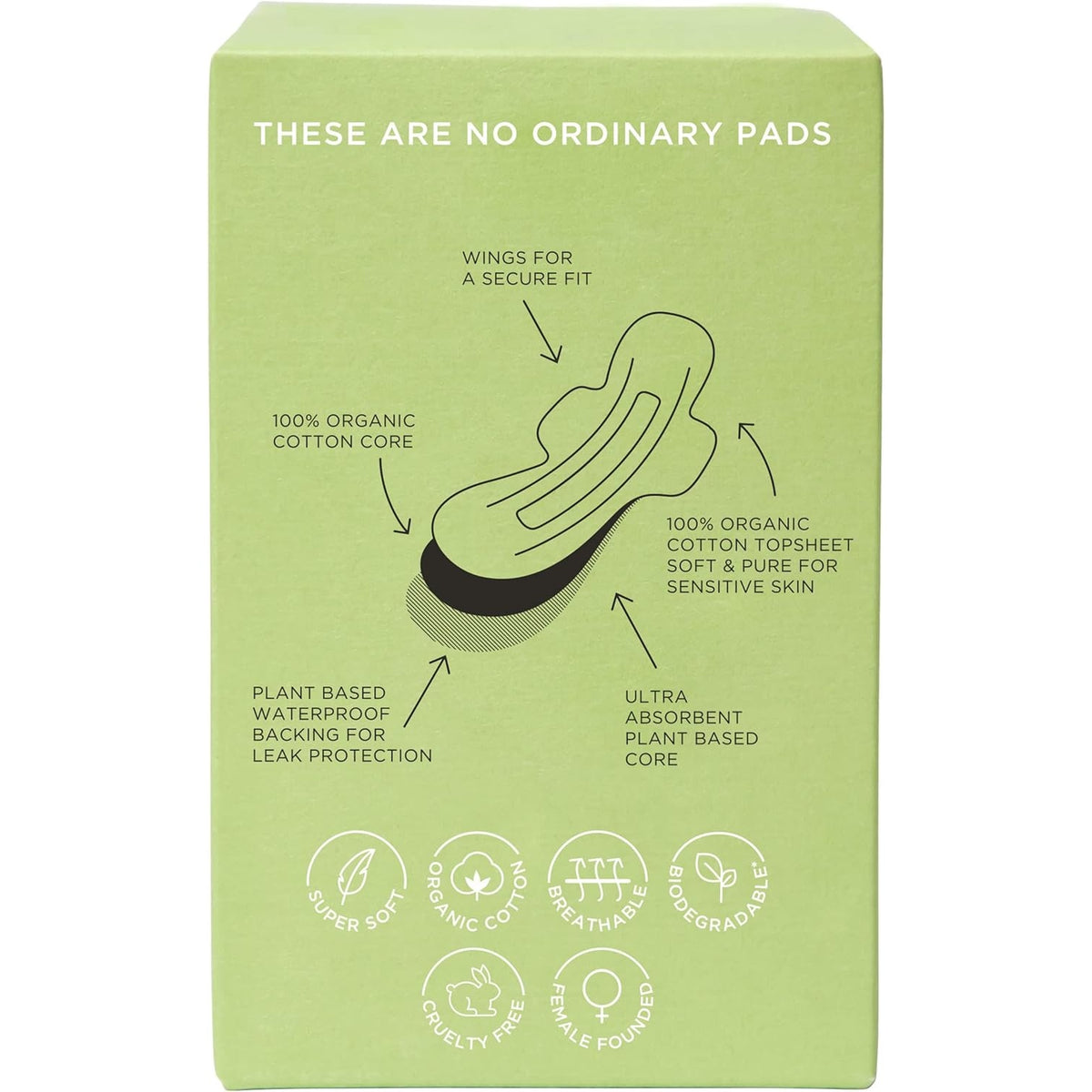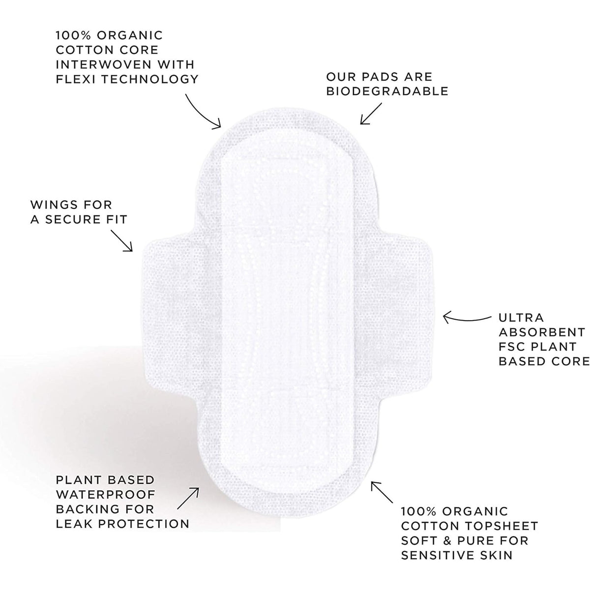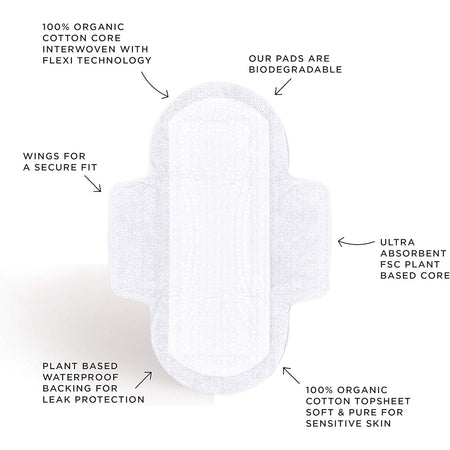 100% Organic Cotton Top Sheet, 100% Organic Cotton Primary Core, TCF Sustainably Harvested Cellulose Absorption Core, Mater-Bi Bioplastic Barrier Back Sheet.TM54CPP