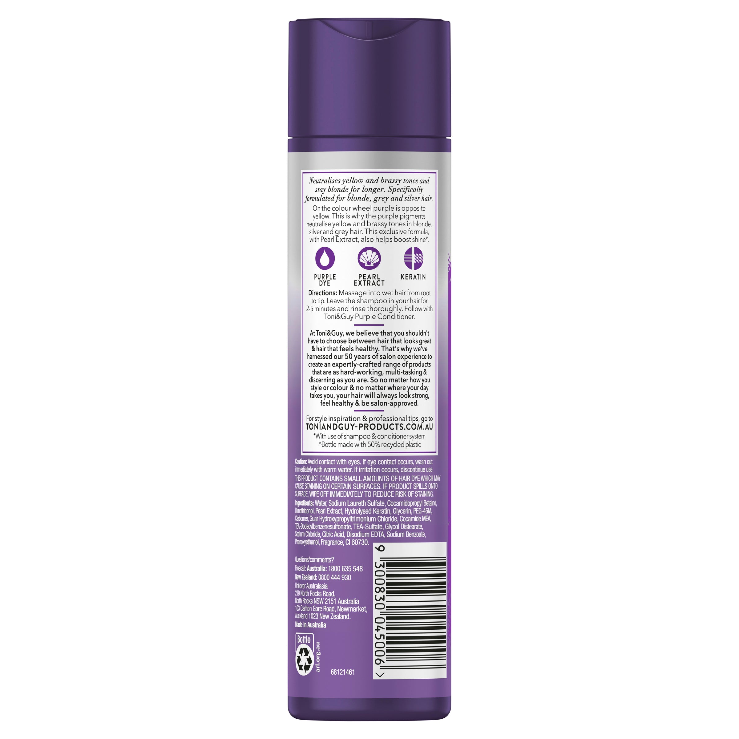 Toni & Guy Purple Shampoo 250mL fights against brassy hair tones and brightens bleached hair. The violet dye helps colour correct copper hair tones, and helps keep your hair vibrant and shiny. Massage onto wet hair from root to tip. Leave the shampoo in your hair for 2-5 minutes and rinse thoroughly. For greater results, apply before Toni&Guy Purple Conditioner. Born in London from a devout love of fashion, TONI&GUY products are inspired by catwalk looks and are used backstage to create standout hair looks for London's most exciting fashion designers. TONI&GUY celebrates individuality, empowering you to express your style through hair and fashion and to create your look from the hair down. With presence backstage at some of the most exciting fashion shows, and with the 4 fabulous style collections infused with backstage know-how; Casual, Classic, Glamour & Creative, TONI&GUY Hair Meet Wardrobe promises to take your style to a whole new level. Looking for hairstyle inspiration? Check out our website TONIANDGUY-PRODUCTS.COM for professional tips on how to achieve catwalk ready hairstyles - we bring you all you need to know about global trends for this season & every season to come. We would love to hear your thoughts! If you enjoyed using this product, please share a review. Strengthen, refresh, hydrate, nourish or moisturise with our wide range of hair care products.Boxed Contents: 250 ML