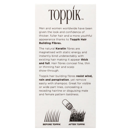 Toppik Hair Building Fibres instantly make thinning hair look thick and full. It's Keratin fibres cling to existing hair and in seconds fill in all thinning or balding areas. Toppik won't come off in wind, rain, or perspiration. It is totally undetectable, even from as close as two inches. All you will see is thicker-looking hair!
