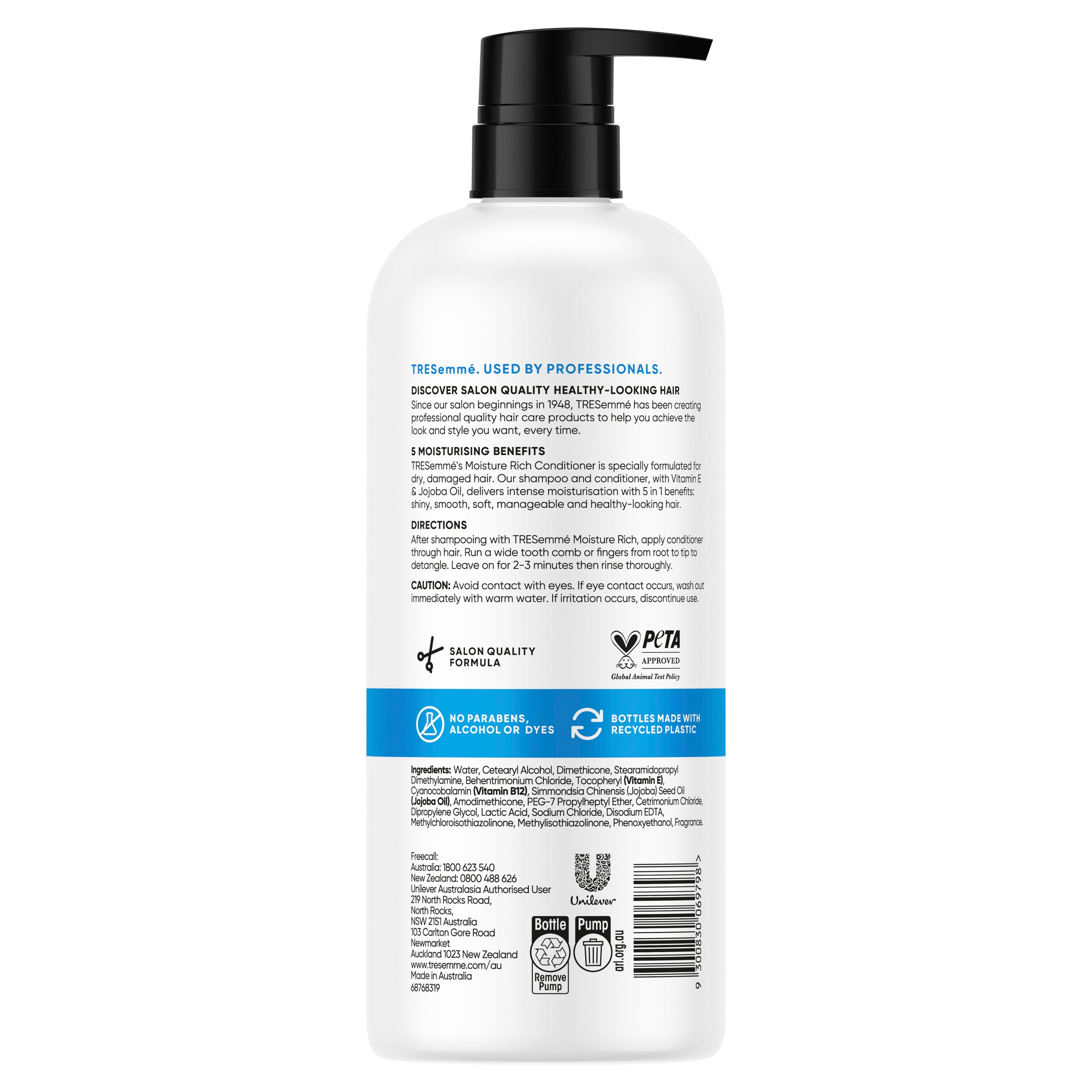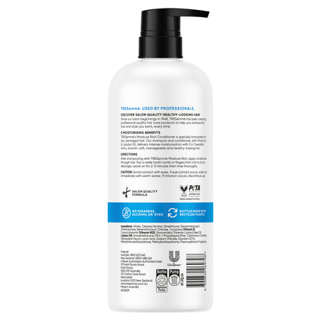 TRESemme's Moisture Rich Conditioner is specially formulated for dry, damaged hair. Our Moisture Rich shampoo and conditioner, with vitamin E and jojoba oil, delivers intense moisturisation with 5 in 1 benefits: shiny, smooth, soft, manageable, and healthy looking hair. Free from parabens, alcohol, and dyes, this moisturizing conditioner is light enough for daily use and the moisture-balanced system transforms your dry hair into silky, manageable, salon and healthy-looking locks. Since our salon's beginnings in 1948, TRESemme has been creating professional quality hair care products to help you achieve the look and style you want, every time. TRESemme understands how great hair gives you the confidence to walk taller every day. Inspired by stylists and tested in salons, the products are designed to help you achieve a salon's gorgeous hair every day. They are salon-quality formulas without the salon price tag. TRESemme does not test on animals and is PETA-approved worldwide. Bottles are made in Australia, with 50% Australian Recycled Plastic and are recyclable. Directions: After shampooing with TRESemme Moisture Rich, apply conditioner through the hair. Run a wide tooth comb or fingers from root to tip to detangle. Leave on for 2–3 minutes then rinse thoroughly then style with your favourite TRESemme products. For more secrets from our professional stylists and details on TRESemme styling appliances & tools, visit www.tresemme.com/au, Professional quality at your fingertips. Can cause eye irritation. In case of contact with eyes, rinse thoroughly with water.Boxed Contents: 940 ML