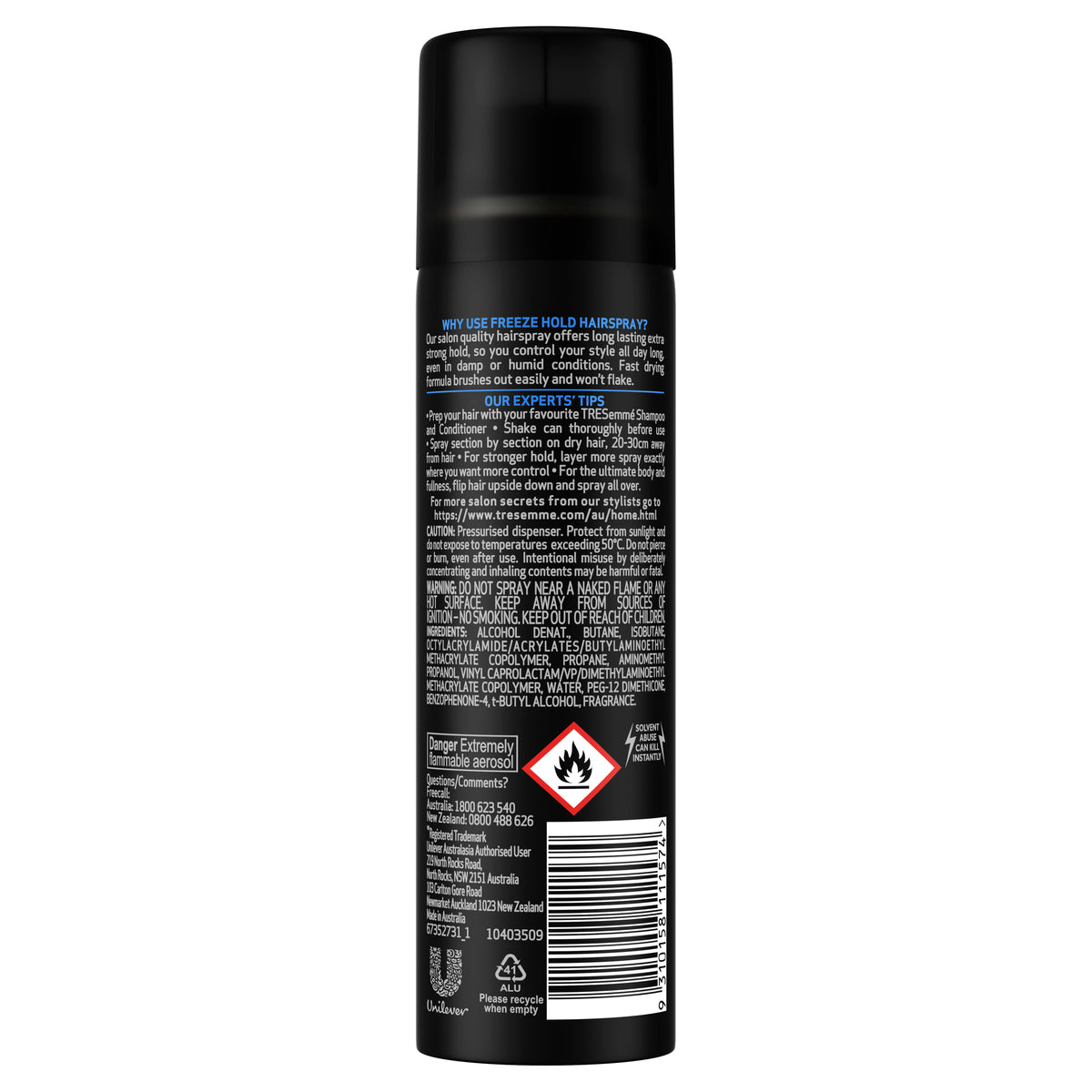 • TRESemme Salon Finish Freeze Hold Hairspray fully secures your look.• Never sticky or tacky to touch.