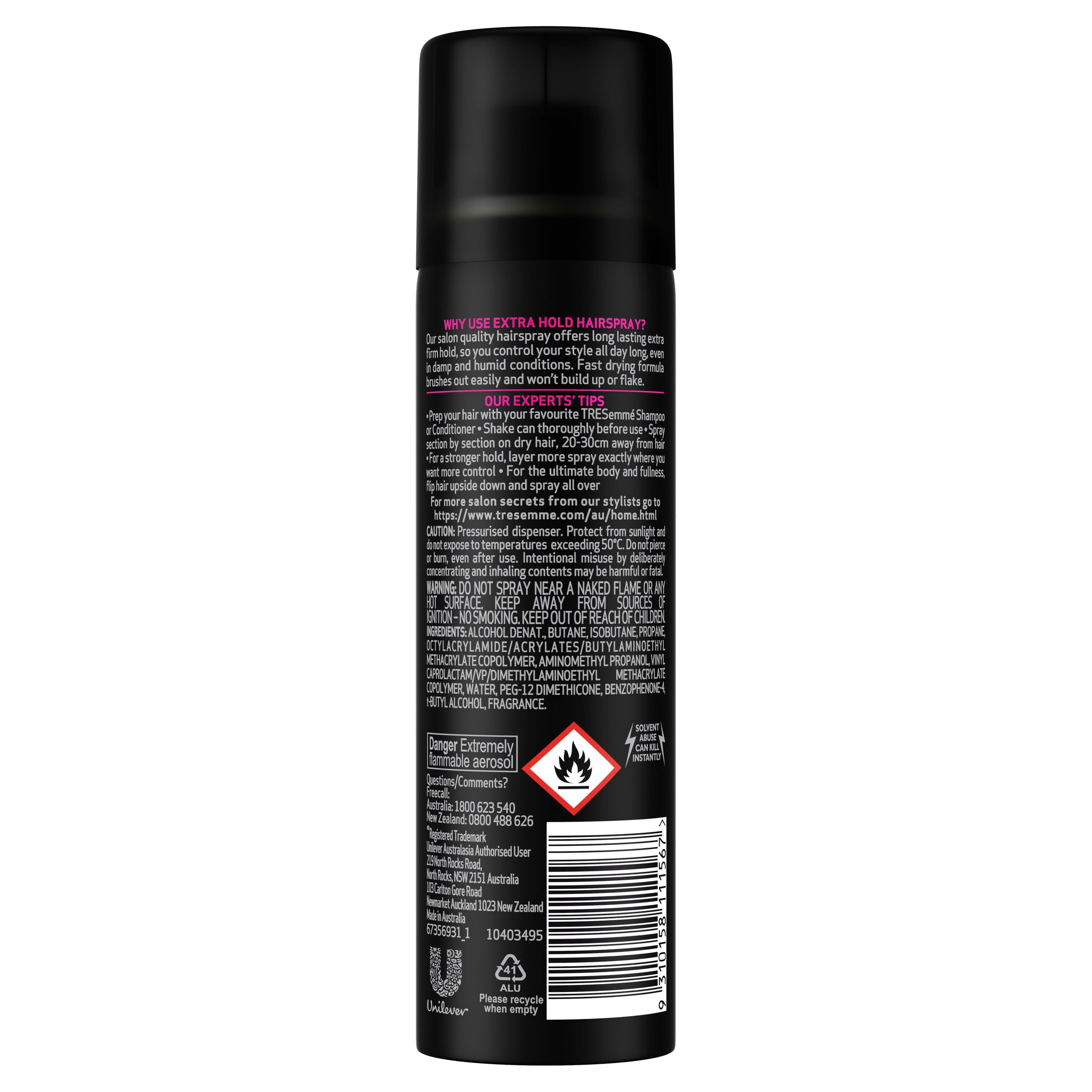 • TRESemme Salon Finish Extra Hold Hairspray achieve maximum hold with extra flyaway control.• No stiffness or stickiness.