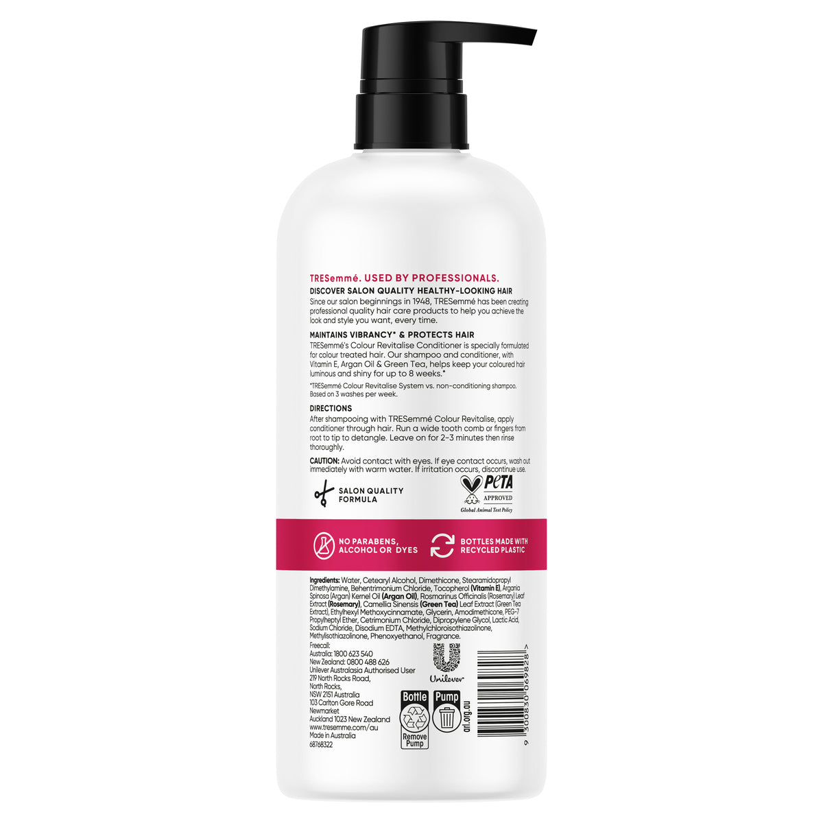 Keeps colour looking more vibrant while providing lightweight conditioning and detangling to colour-treated hair. With green tea, rosemary and sunflower seed oil, this Advanced formula Colour Vibrance Protection conditioner will replenish vital moisture to keep hair healthy looking. Colour stays gorgeous longer and hair is softer and more manageable. TRESemme understands how great hair gives you the confidence to walk taller every day. Delivering that feeling has driven TRESemme since Edna L. Emme founded the brand in 1948. She embodied this confidence; the perfect role model for inspiring modern women today. Intelligent and beautiful, Edna was a rule breaker and entrepreneur, a powerful package who was admired for her beauty but remembered her for her intelligence and tenacity. She was also a trailblazer for women in the workplace. Rising from the machine floor to the boardroom, she became vice-president of the Godfroy Manufacturing Company, a rare achievement in an age when executives were almost exclusively men. From our origins in salons, we have always been driven by a simple truth; every woman deserves to look fabulous without spending a fortune. TRESemme is dedicated to creating hair care and styling products that are salon quality without the salon price. Salon inspired, stylist tested products to help you create your own style and experience that salon feeling every day. TRESemme Colour Revitalise Conditioner is specifically formulated for colour treated hair. Delivers soft, manageable hair that's rich with vibrant colour. Gently conditions to replenish vital moisture and keep hair looking healthy. With green tea, rosemary, and sunflower. Use with TRESemme Colour Revitalise Shampoo.