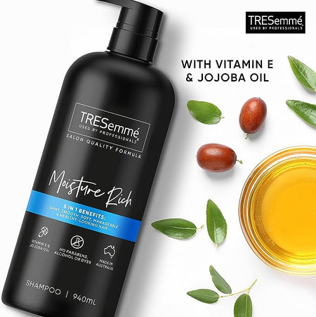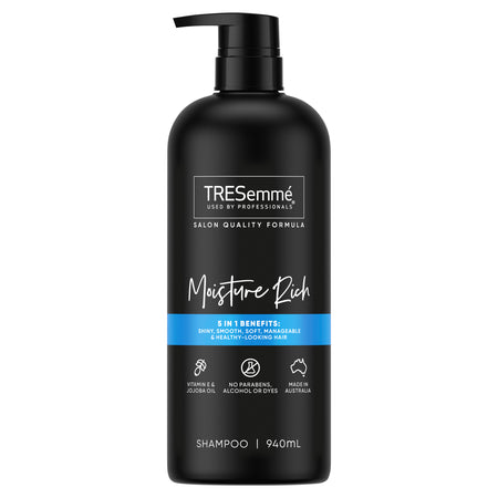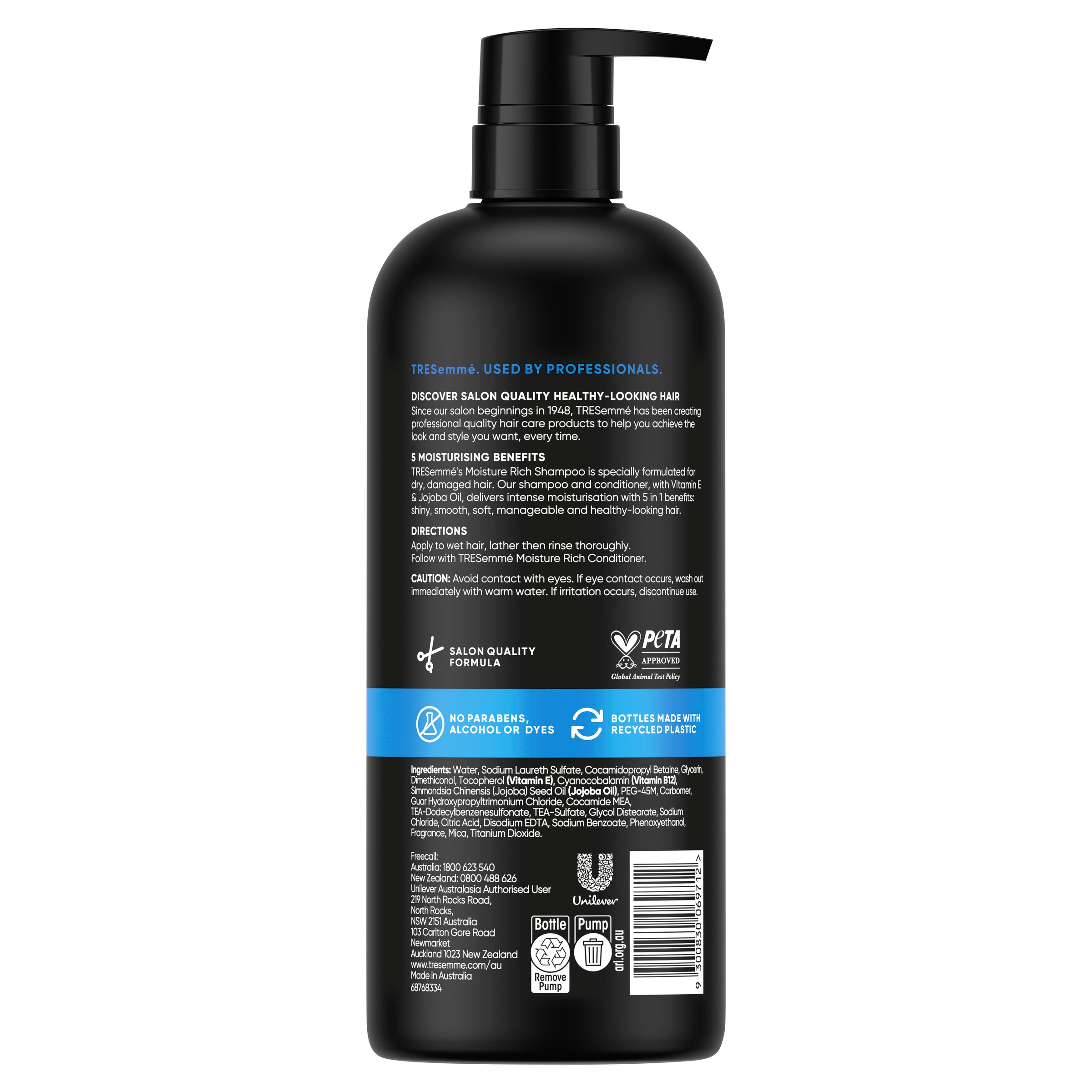 Because you shouldn't have to go a day without salon-healthy hair, the TRESemmé Moisture Rich Shampoo & Conditioner system delivers optimized hydration that targets dryness and locks in moisture where your hair needs it most--- every day. Created for daily use, TRESemmé Moisture Rich Shampoo & Conditioner restores vibrancy for a salon-healthy look and shine. This gentle moisturizing shampoo with vitamin E helps to restore softness---and is formulated to deliver hydration right where your hair needs it most. The result: touchably soft hair with enviable salon shine! Fragrance Description: Mouth-watering melon, crisp apple and juicy peach are the stars of this fresh fruity fragrance. Delicate spring florals of muguet, rose and jasmine, underscored with white musk, add a feminine sophistication.