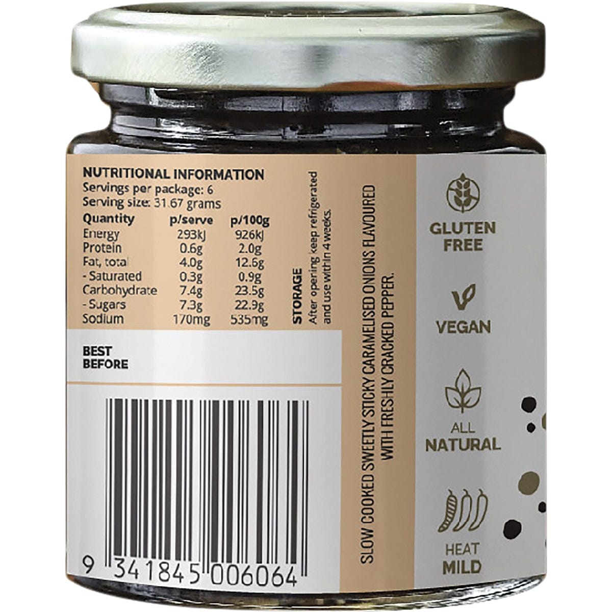 Australian Brown Onions (74%), Brown Sugar, Australian Canola Oil (GMO Free), Water, Salt, Garlic and Black Pepper (1%).TU37CPP