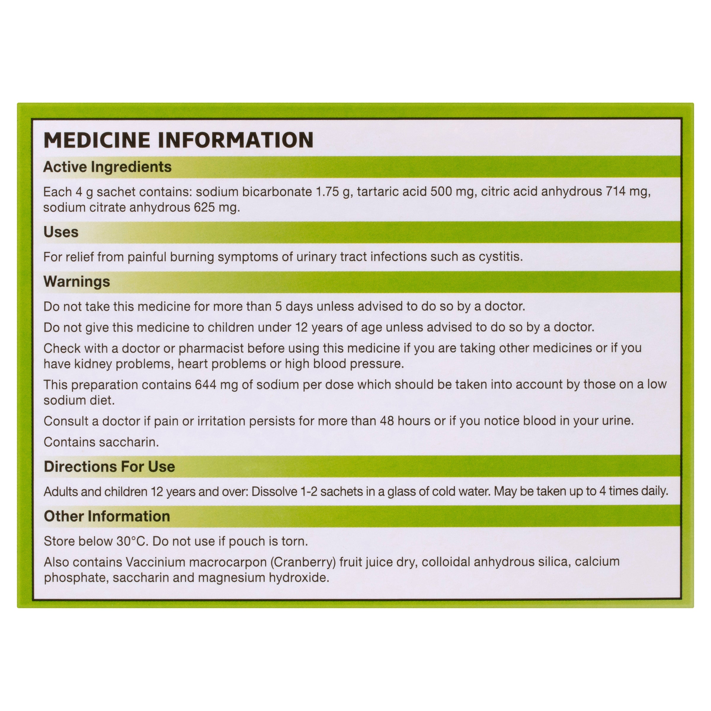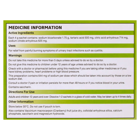 ALWAYS READ THE LABEL. FOLLOW THE DIRECTIONS FOR USE. IF SYMPTOMS PERSIST TALK TO YOUR HEALTHCARE PROFESSIONAL. The information provided is not intended to be a substitute for professional medical advice. Please speak to a healthcare professional if you have any questions about cystitis or its treatment. See your doctor if pain or irritation persists for more than 48 hours or if you notice blood in your urine.Do not give to children aged younger than 12 without medical advice. Check with a doctor or pharmacist before use if you are taking other medicines.