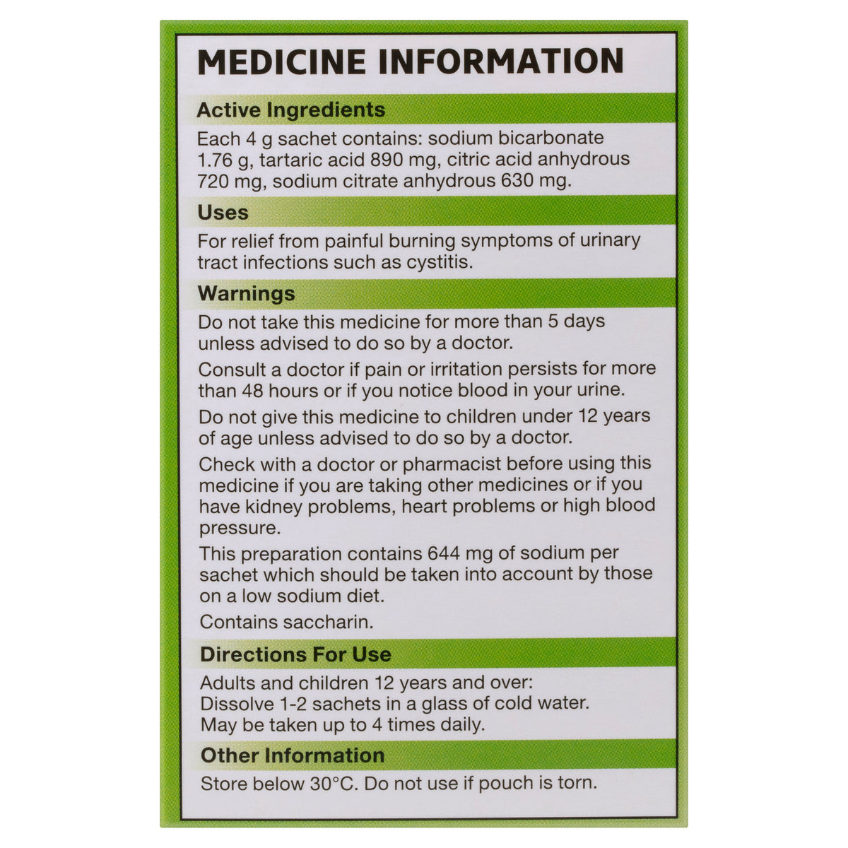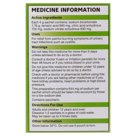 Consult a doctor if pain or irritation persists for more than 48 hours or if you notice blood in your urine.This preparation contains 644 mg of sodium per sachet which should be taken into account by those on a low sodium diet.Check with a doctor or pharmacist before using this medicine if you are taking other medicines or if you have kidney problems, heart problems or high blood pressure.