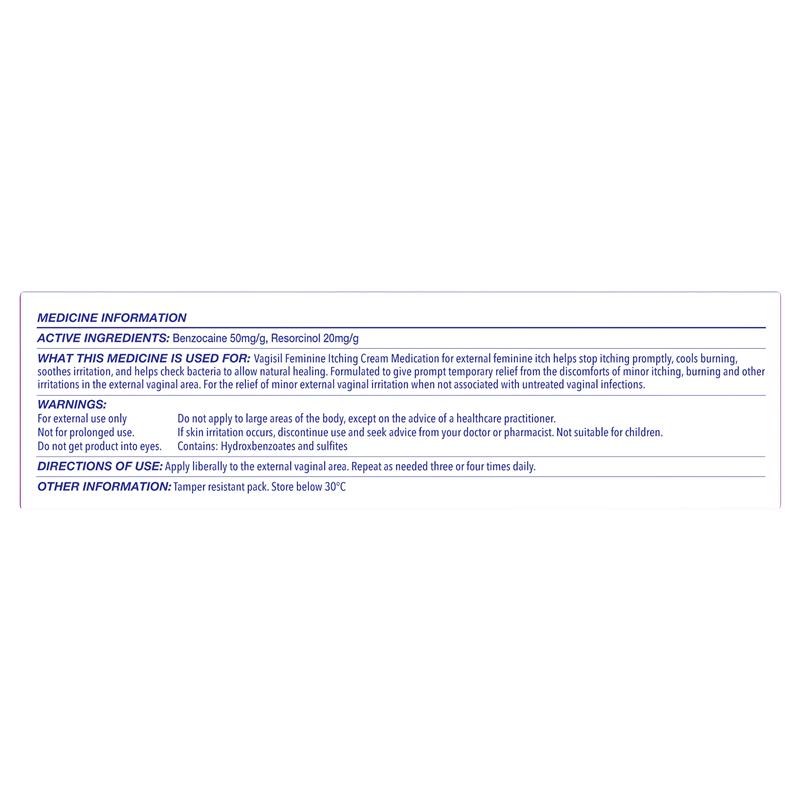 Your period, perspiration and tight clothes can often cause intimate itch and irritation. Vagisil Feminine Itching Cream Medication has been formulated to give prompt temporary relief from the discomfort of minor itching, burning and irritations in the external vaginal area. The anaesthetic in Vagisil works fast to help stop the itching, cool the burning and soothe irritation. Vagisil is non-staining and greaseless. Keep Vagisil Feminine Itching Cream Medication on-hand in your bathroom cabinet for fast, easy and gentle relief whenever awkward itch arises.Size: 25g.