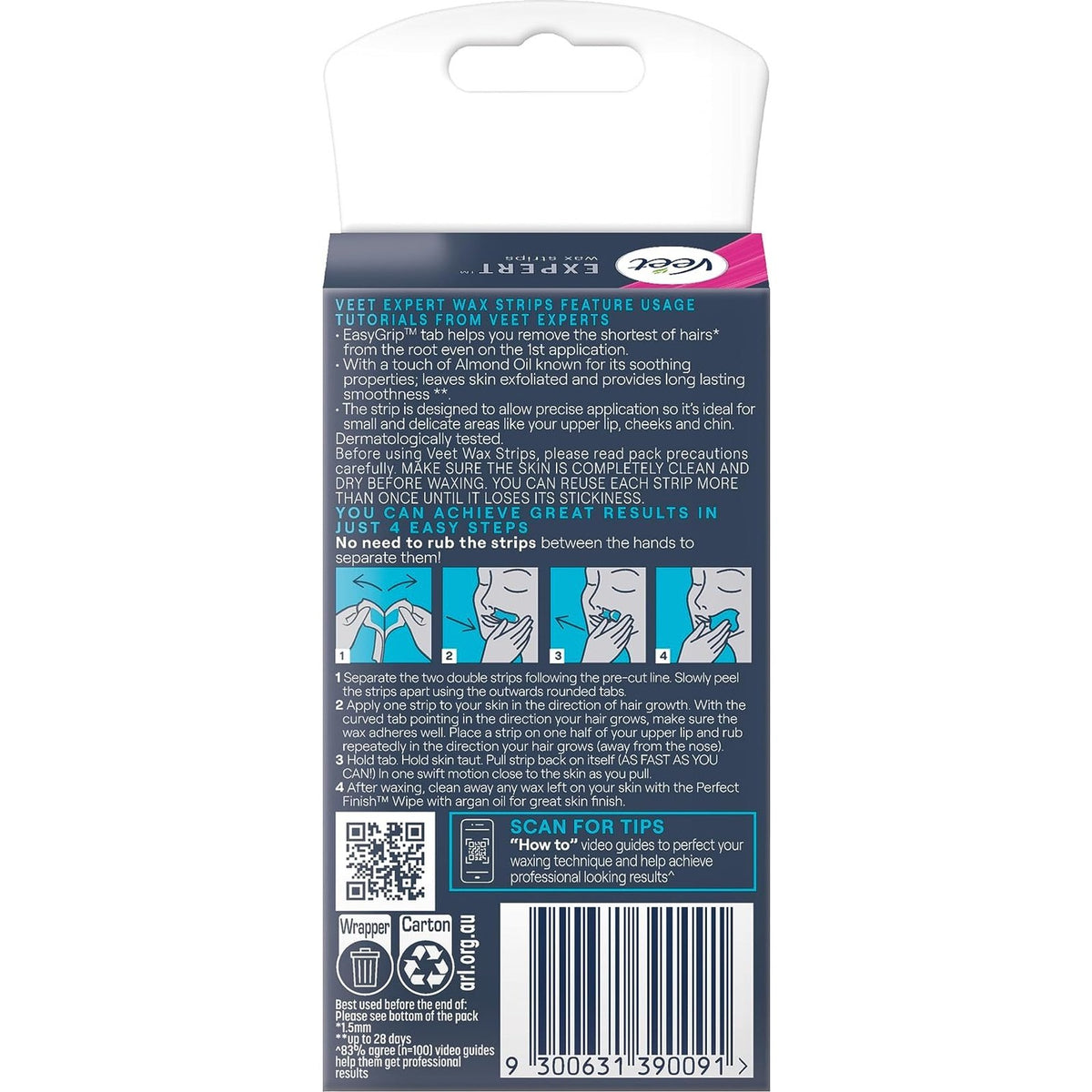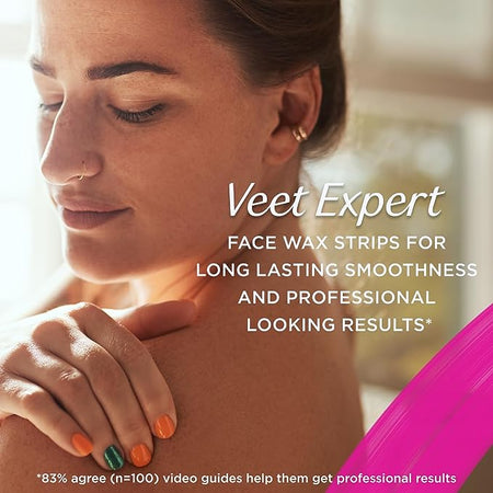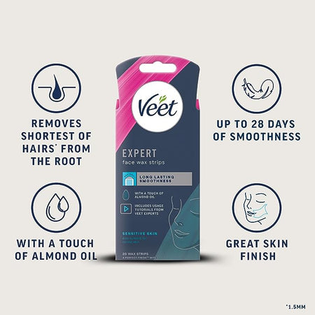 Reveal your real with the confidence to achieve great results. Veet Expert Face Cold Wax Strips help you remove the shortest of hairs from the root, contain a touch of Almond Oil for its soothing properties, leave skin exfoliated, and provides smoothness that lasts up to 28 days. It gives the confidence to achieve great results even for those inexperienced with waxing.