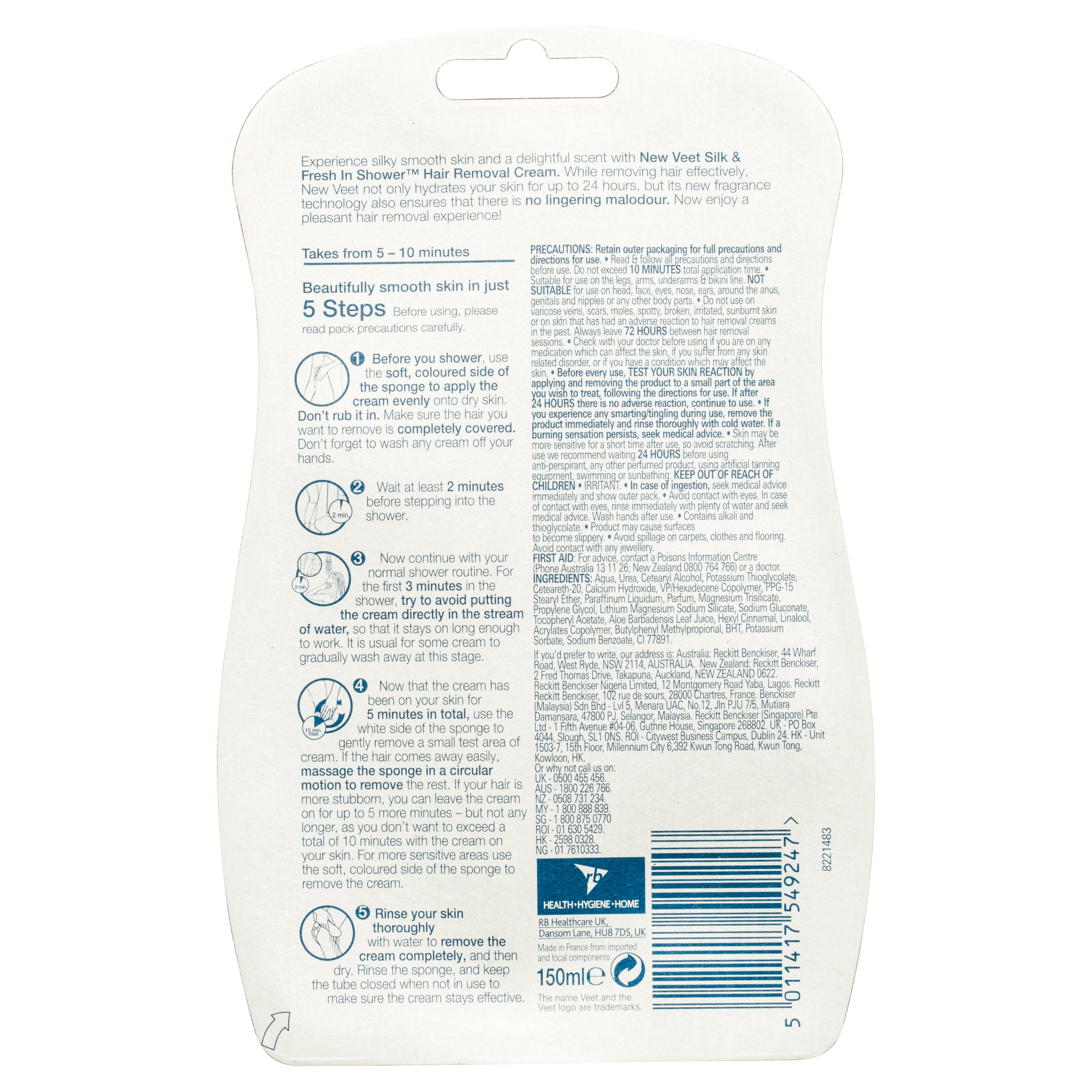 Experience silky smooth skin and a delightful scent with New Veet Silk & Fresh In Shower Hair Removal Cream. While removing hair effectively, New Veet not only hydrates your skin for up to 24 hours, but its new fragrance technology also ensures that there is no lingering malodour. Now enjoy a pleasant hair removal experience!Â