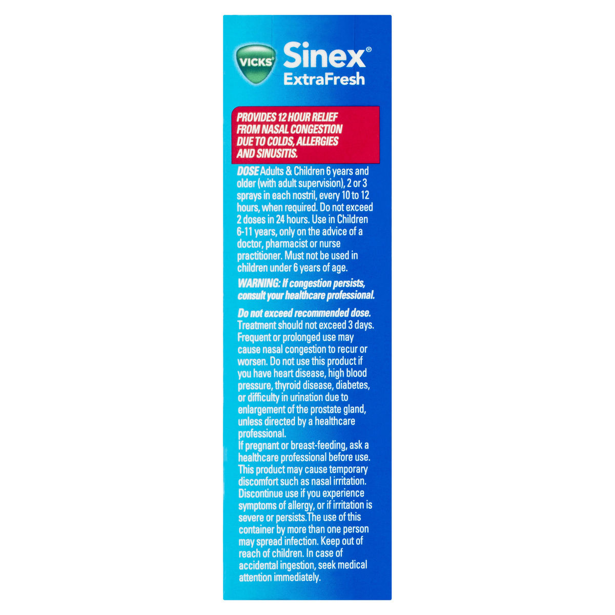 Adults & Children 6 years and older (with adult supervision), 2 or 3 sprays in each nostril, every 10 to 12 hours, when required. Do not exceed 2 doses in 24 hours. Use in Children 6-11 years, only on the advice of a doctor, pharmacist or nurse practitioner. Must not be used in children under 6 years of age.