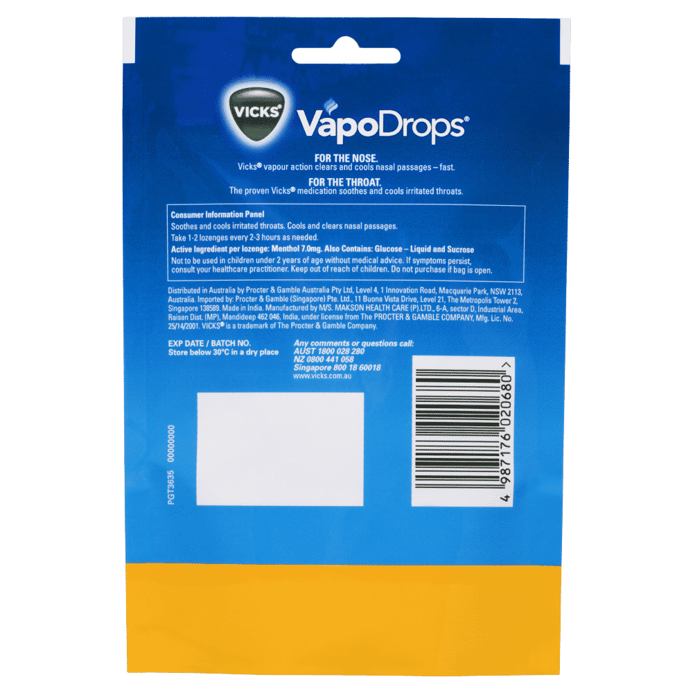 Vicks VapoDrops will quickly relieve the "throat tickle" that precedes a coughing fit and could prevent you from using your voice with confidence! The lozenges will help to clear the nose and soothe your throat. Feel the effect in seconds!