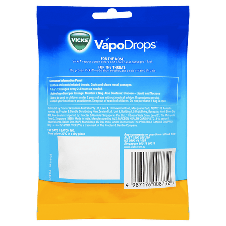 - Vicks VapoDrops temporarily relieves sore throat and blocked nose. It soothes the throat and clears the nose.