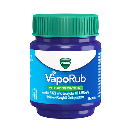 Vicks VapoRub Chest Rub and Vapourising Ointment provides up to 8 hours relief from cold symptoms.