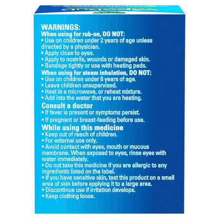 Keep out of reach of children. For external use only.Use only as directed. If fever is present or symptoms persist, consult a physician. Avoid contact with eyes. Do not take by mouth or place in nostrils. Not to be used on children under 2 years of age unless directed by a physician. Discontinue use if irritation develops. Do not apply to wounds or damaged skin. Do not bandage tightly or use with heating pads.