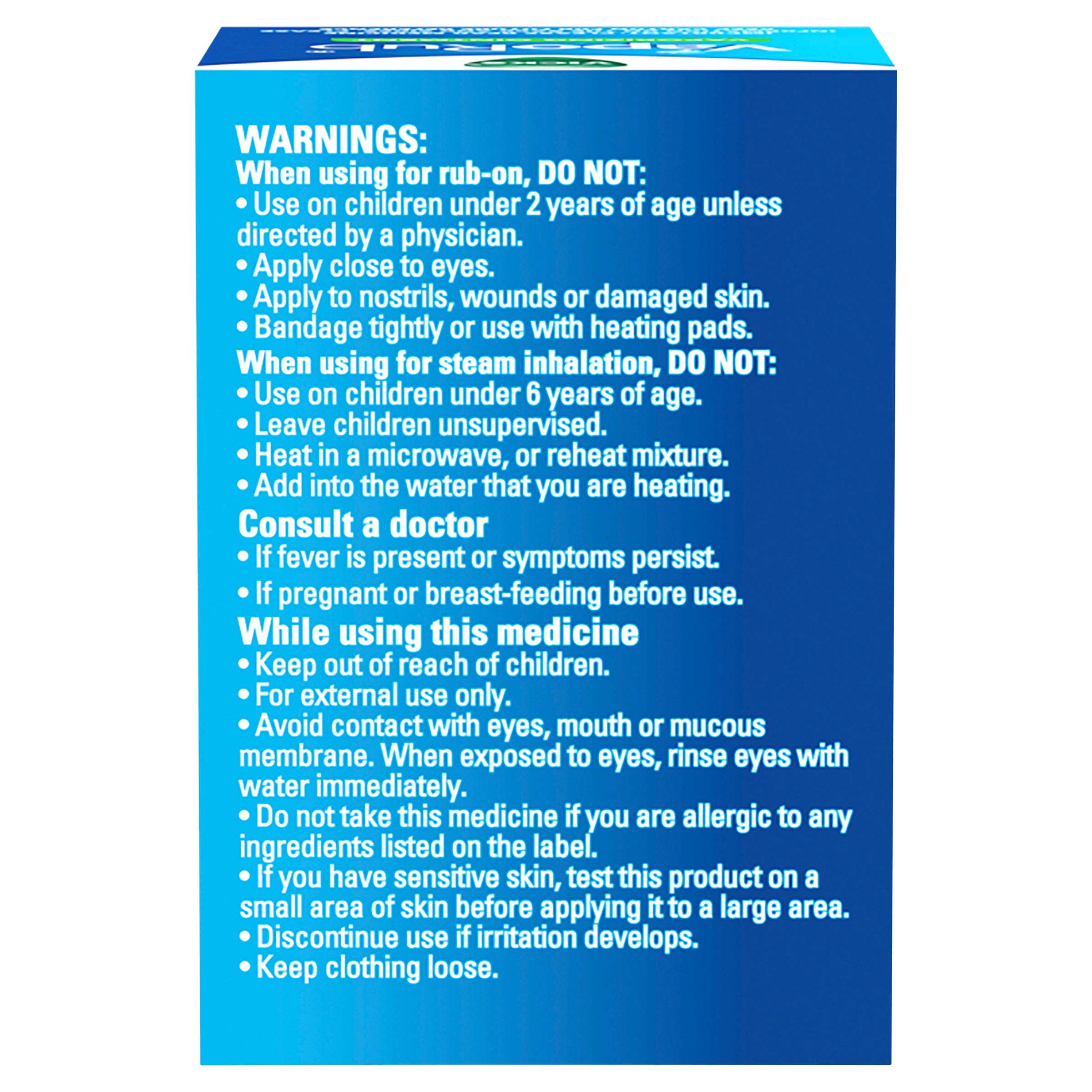 Part fill a bowl with steaming water (not boiling) and add 2 teaspoonfuls of VapoRub. Then gently inhale the steaming vapours with a towel over your head and bowl. Children should be closely supervised to avoid scalding. May be repeated up to four times a day. Discard bowl contents after use. For temporary relief of minor muscular aches and pains. Use on sore muscles. Rub into skin up to four times a day or as directed by a doctor.