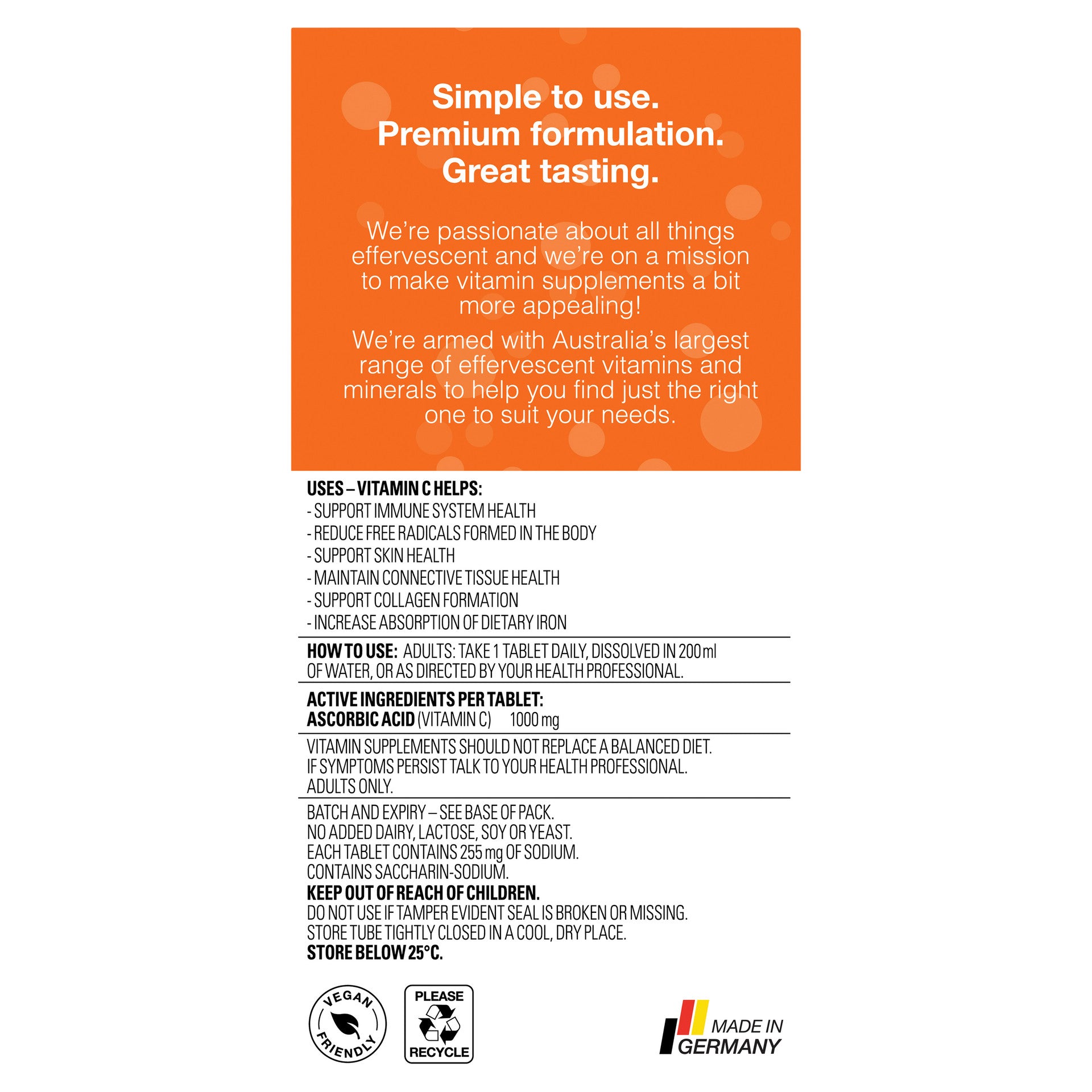 No added dairy, lactose, soy, or yeast. Each tablet contains 360mg of Sodium. Contains Saccharin-Sodium. Vitamin supplements should not replace a balanced diet. If symptoms persist, consult your healthcare professional. Adults only.