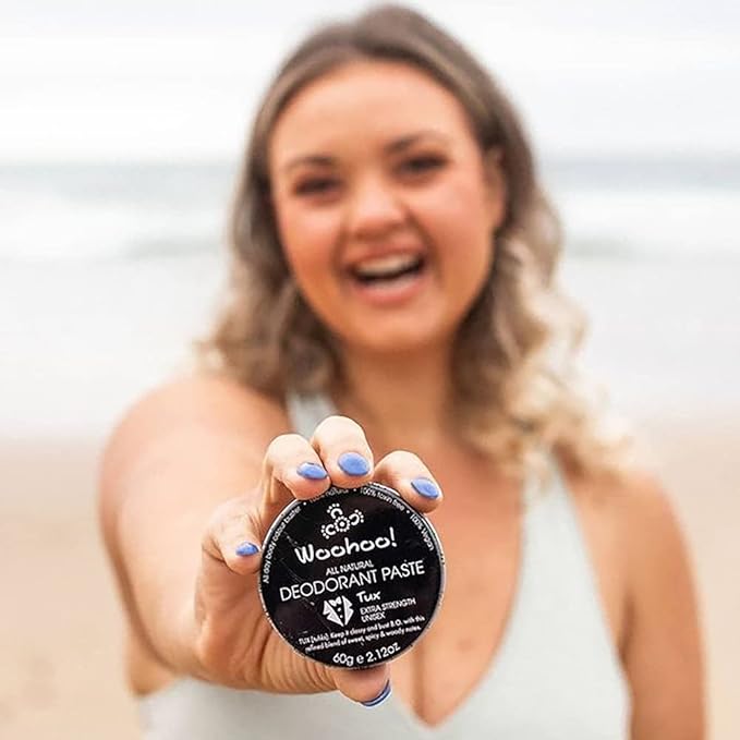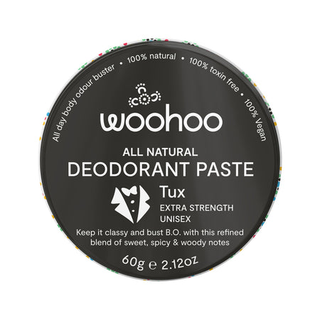 The 100% natural, 100% effective Woohoo Tux Deodorant Paste is all-class. This extra-strength all-natural deodorant paste will banish body odour in style, keeping you freshen all day and into the night. The bergamot and patchouli scent is a top-shelf blend of sweet, spicy and woody notes. Just scoop a small amount, melt it between your fingers, and rub it in like moisturiser for 24-hour protection from body odour.