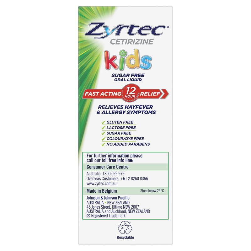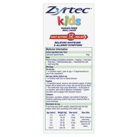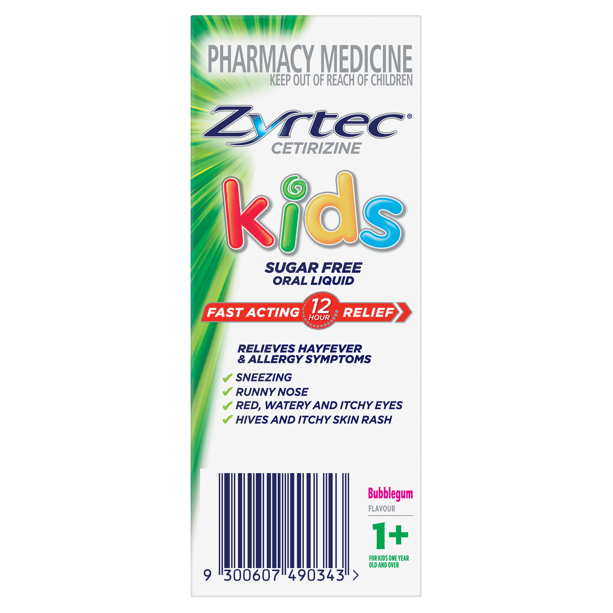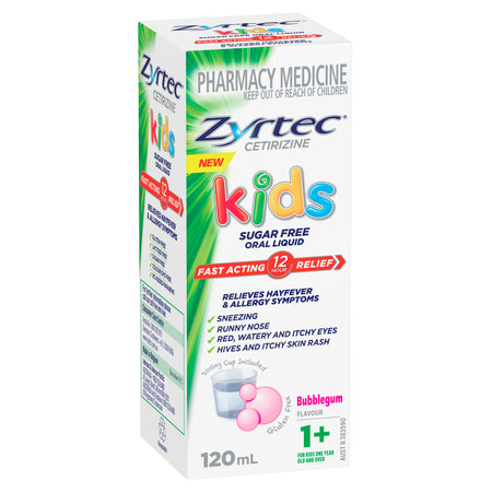 Zyrtec® Kids Rapid Acting 12 hour Allergy & Hayfever Relief Antihistamine Oral Liquid Bubblegum flavour relieves hayfever & year around allergy symptoms, and is sugar, gluten and dye free. Zyrtec Kids Oral Liquid Bubblegum flavour is suitable for children 1+ and has a measuring cup included.Zyrtec Kids contains the active ingredient, cetirizine, which helps to block the production of histamine to relieve symptoms of hayfever and year round allergies. Cetirizine is part of a class of medications called antihistamines.