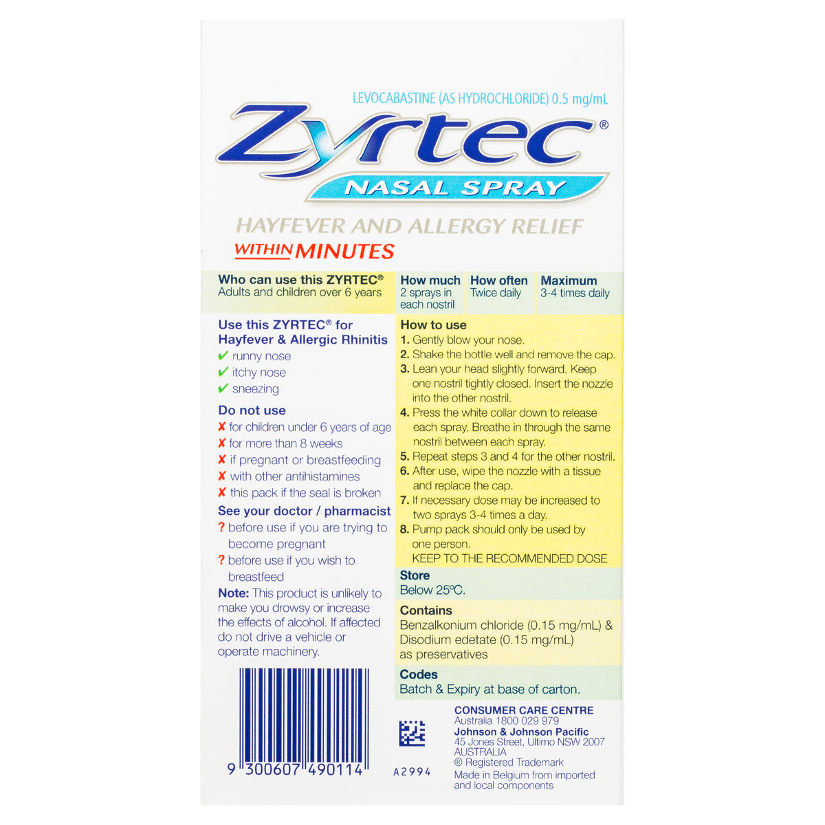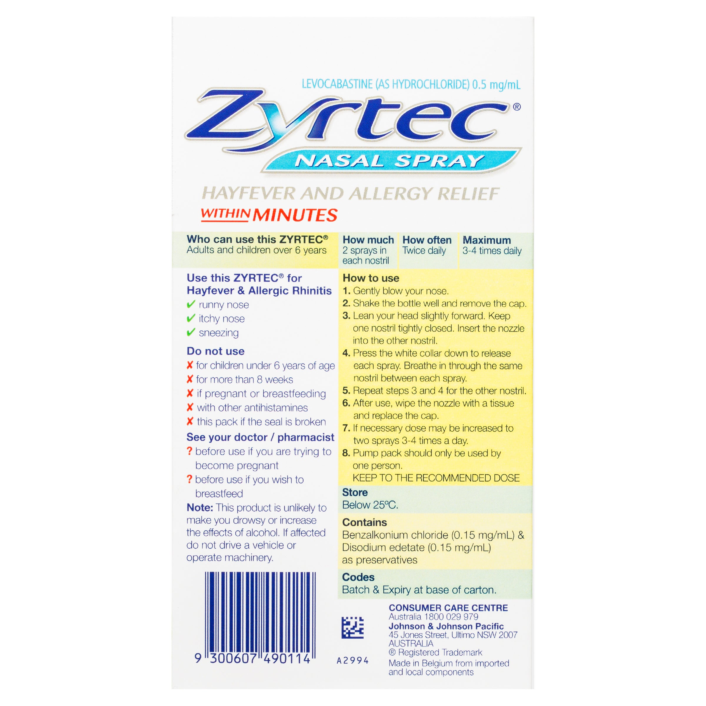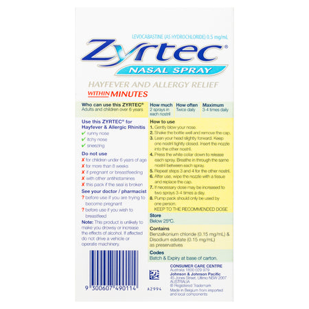Zyrtec Levocabastine Nasal Spray for hayfever and allery relief within minutes. Non drowsy formula antihistamine for sneezing, running nose and itchy nose.