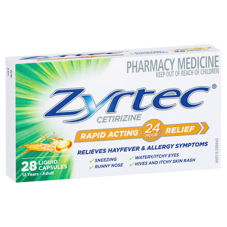 | Description | Zyrtec Rapid Acting Hayfever Liquid Antihistamine Capsules relieve hayfever allergy symptoms for adults and children over 12 years. This hay fever & allergy medicine, provides long lasting, fast acting hayfever relief for 24hrs. Bulk 28 value pack. |